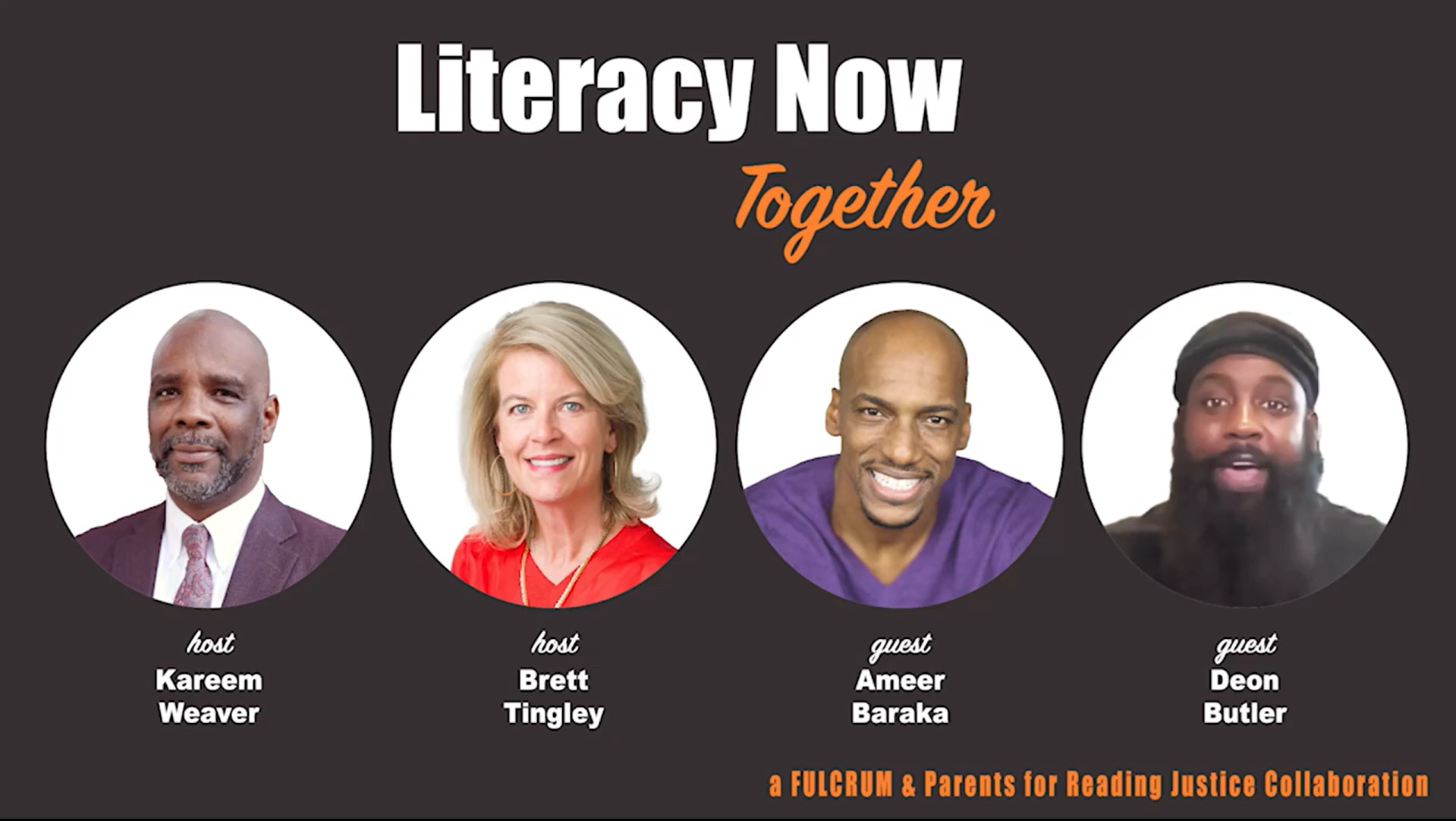 Hosts Kareem Weaver and Brett Tingley with guests Ameer Baraka and Deon Butler on the podcast “Literacy Now Together,” a Fulcrum Literacy and Parents for Reading Justice collaboration.